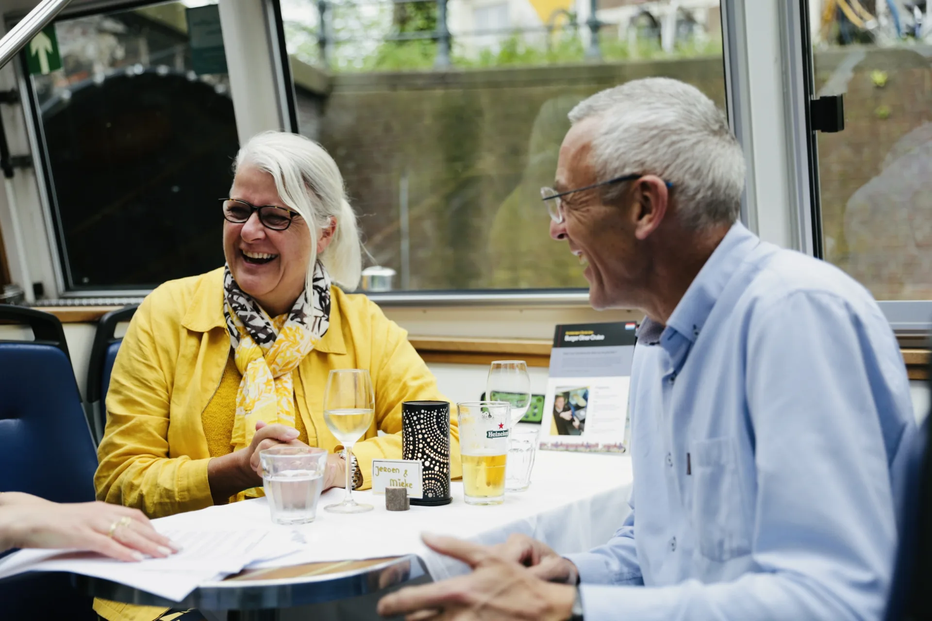 Onze schipper en host verwelkomen je graag aan boord bij onze opstap locatie naast het Anne Frank Huis. Tijdens de rondvaart verteld de schipper verhalen over de stad in het Engels, daarnaast is er ook een audio guide beschikbaar in meerdere talen. De host serveert drankjes uit terwijl jij ontspant en geniet van het uitzicht. Bij mooi weer gaan de daken open en kun je zelf de ramen naast je tafel openen. Op het open achterdek kun je heerlijk buiten zitten, en daarnaast is er ook een toilet aan boord voor je gemak.