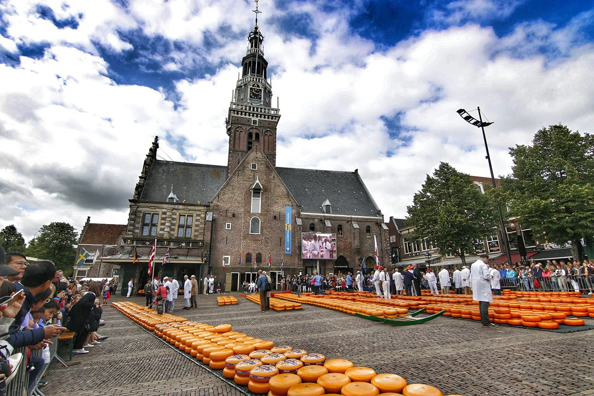 Duizenden bezoekers van over de hele wereld komen naar Alkmaar voor de beroemde kaasmarkt, een spectaculair evenement dat het Waagplein omtovert tot een levendig tafereel vol kaas en energieke kaasdragers. Het is een traditie die meer dan 400 jaar geleden is ontstaan. Tegenwoordig is de kaasmarkt in Alkmaar de grootste ter wereld en een must-see voor kaas- en geschiedenisliefhebbers. Elke vrijdag wordt het Waagplein omgetoverd tot een kleurrijk spektakel, met duizenden kazen en de karakteristieke kaasdragers die zich in traditionele outfits over het plein begeven. Rondom de markt wordt een gezellige ambachtsmarkt en braderie georganiseerd, waar lokale producten en handgemaakte souvenirs te koop zijn. Het is de perfecte gelegenheid om niet alleen de beroemde kaasmarkt te bewonderen, maar ook de charme van het historische Alkmaar te ontdekken.